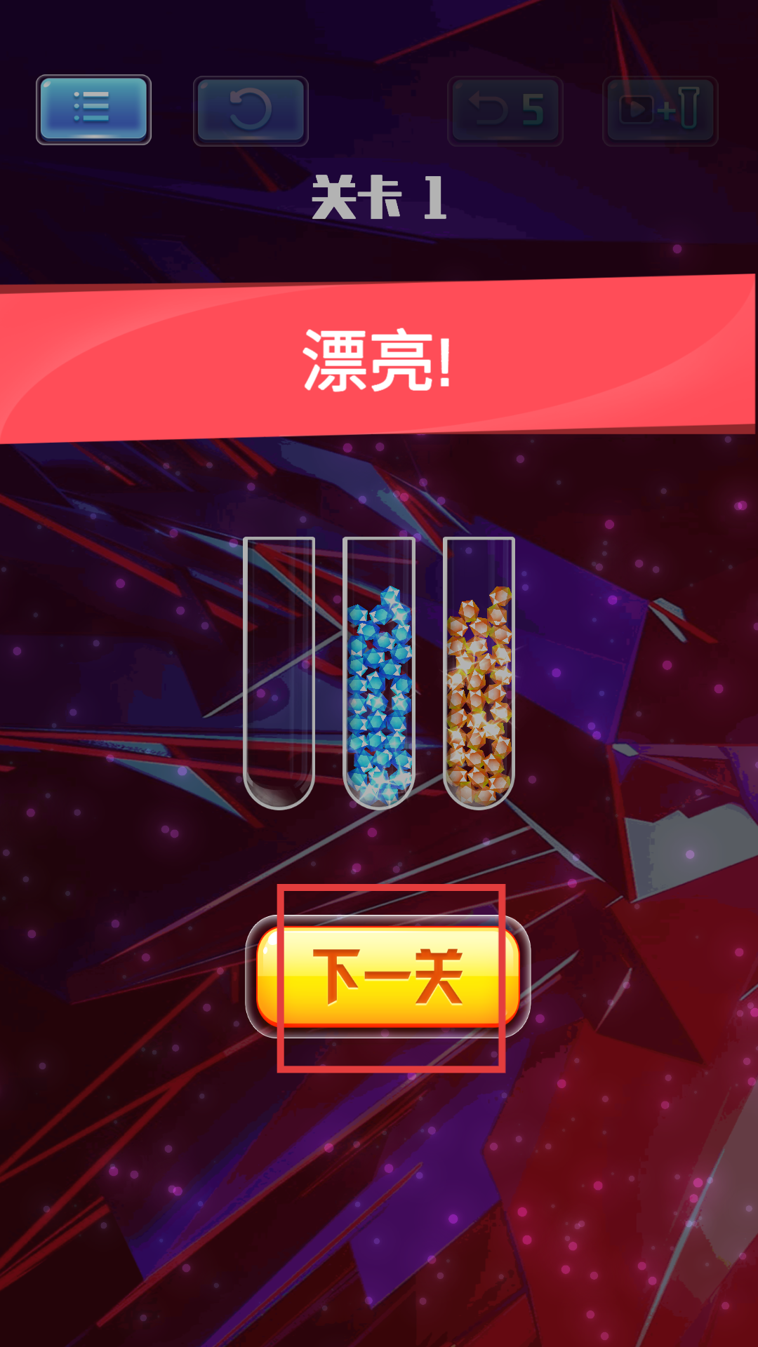 3、通关后试管会整齐排列,同色钻石各居其位,点击屏幕下方的按钮即可进入新的关卡。
