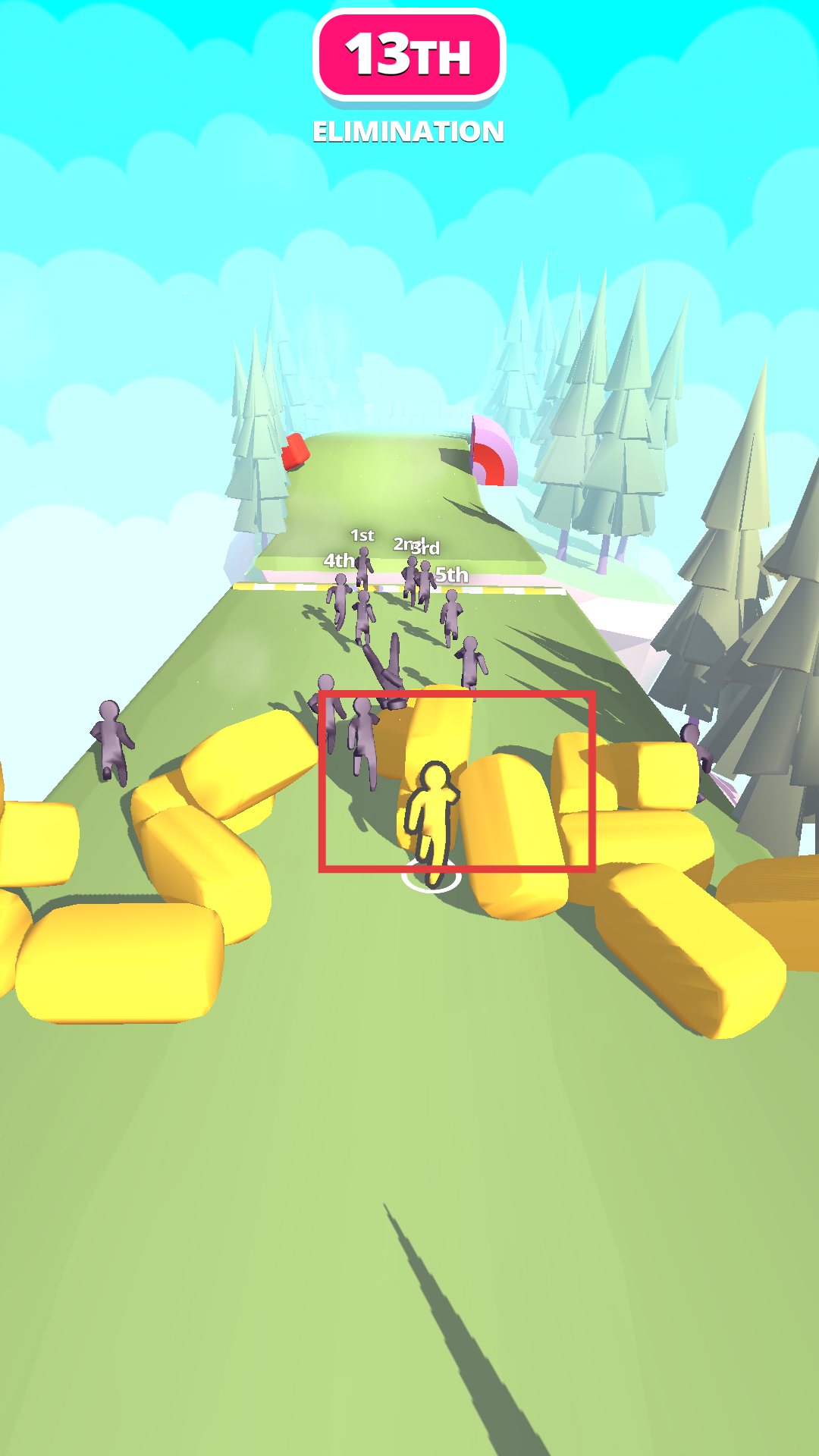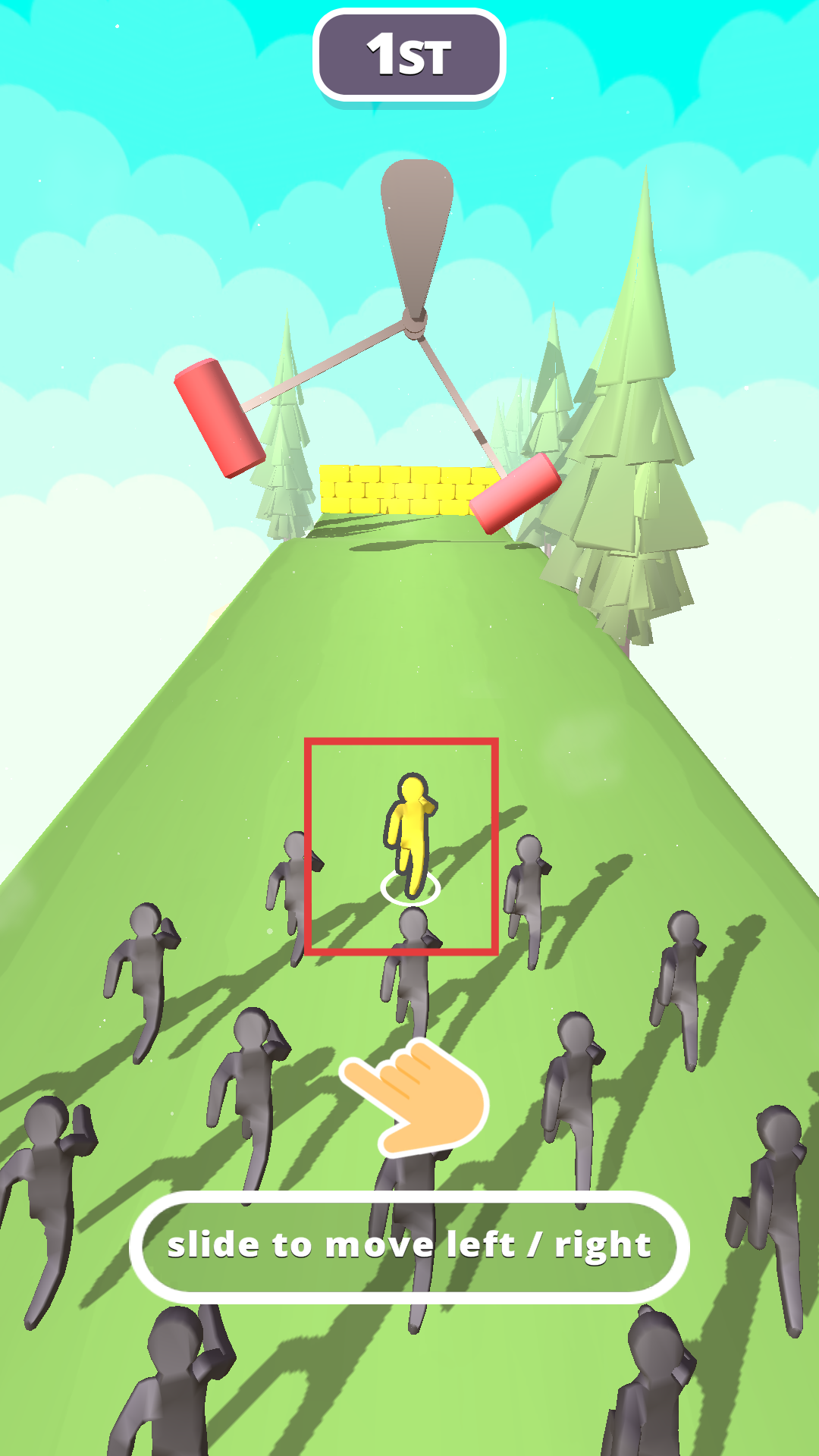1、进入作品后,我们滑动屏幕控制黄色小人左右移动,避开障碍物,在跑道上保持领先。