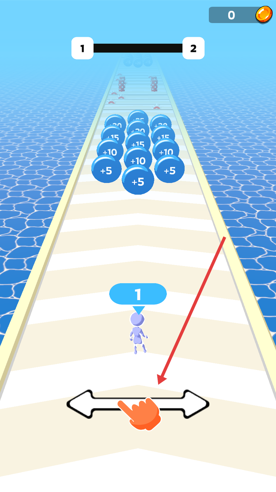 1、开局操控紫色角色,通过左右箭头按键,引导角色收集蓝色+5,+10等圆球,增加队伍数量。
