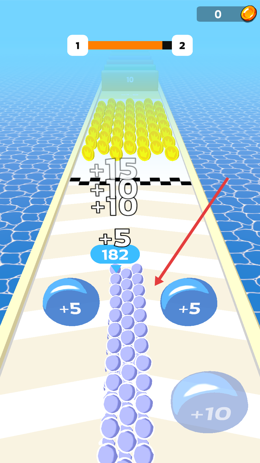 2、行进中,避开红色障碍,尽量走圆球密集路径,积累角色数量,冲向金币区,获取更多资源。