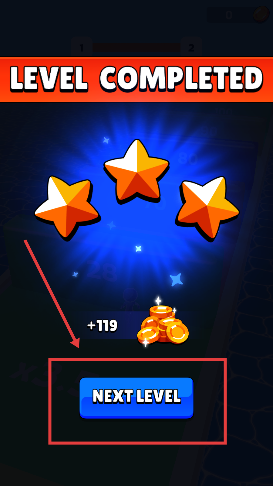 3、通关后,点击NEXTLEVEL进入下一关,重复操作,利用数量优势,挑战更高难度Level。