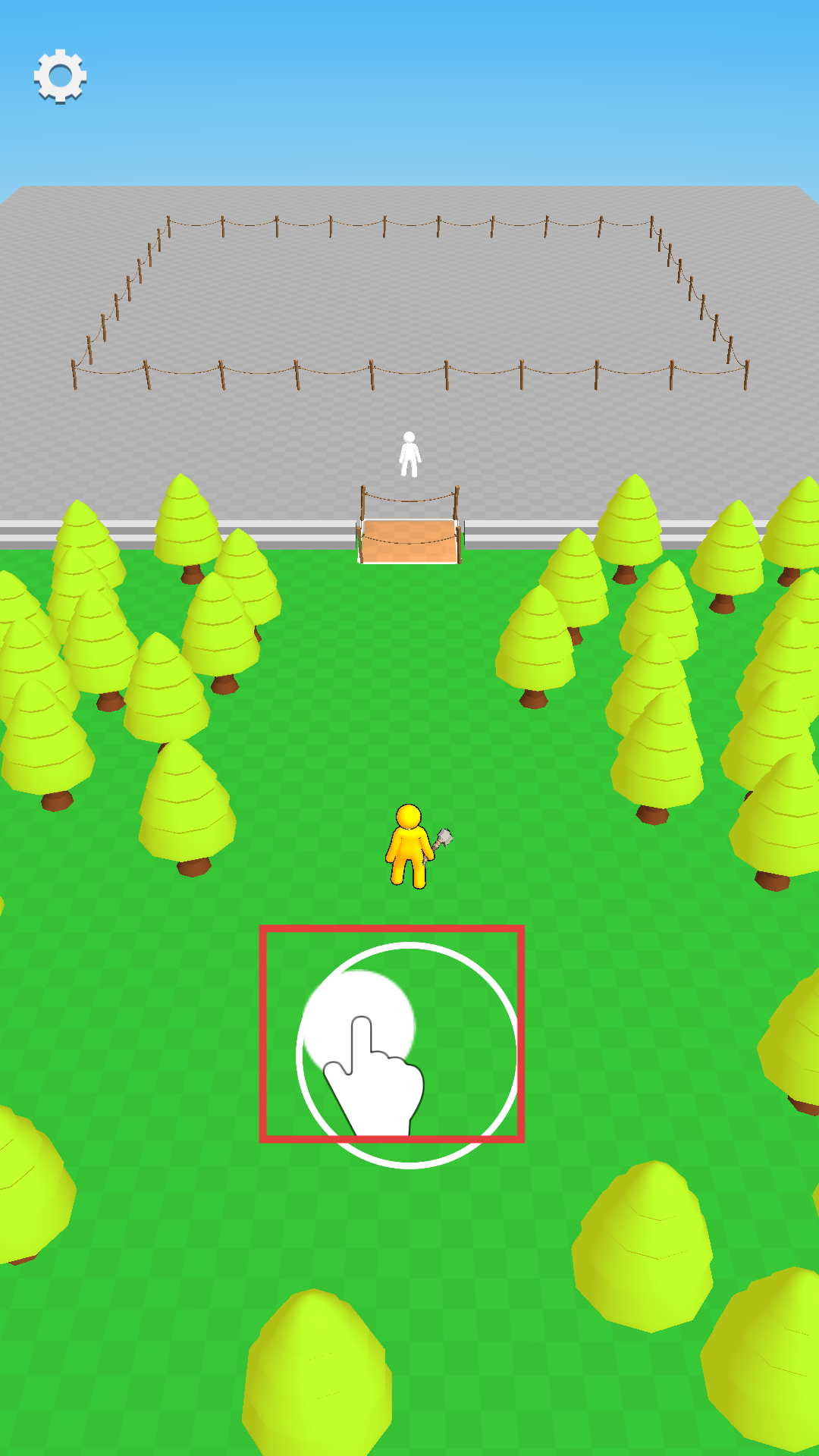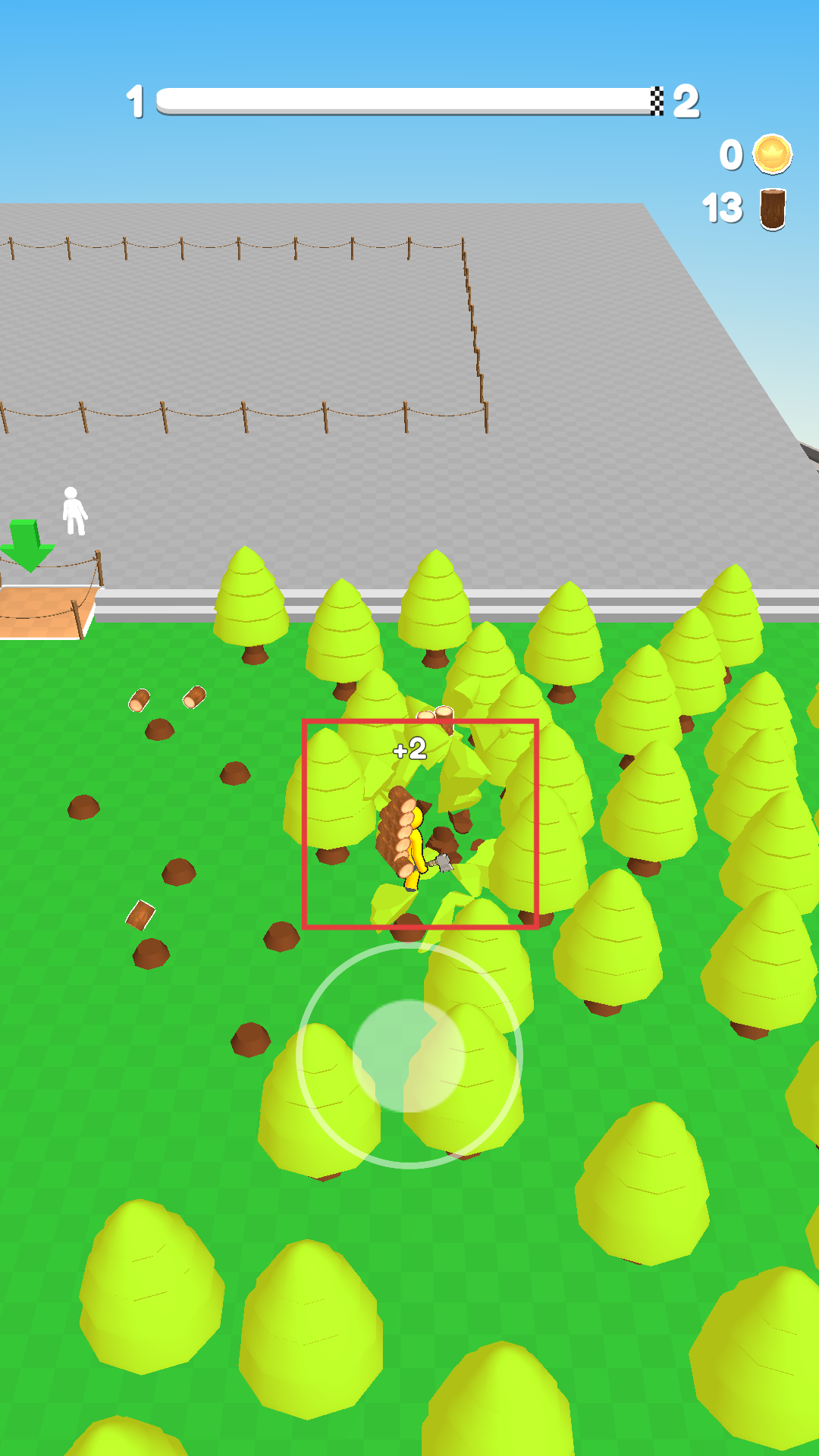 1、点击屏幕操控黄色小人移动,朝着树林区域行进,在树林里不断砍伐树木,以此来收集木材。