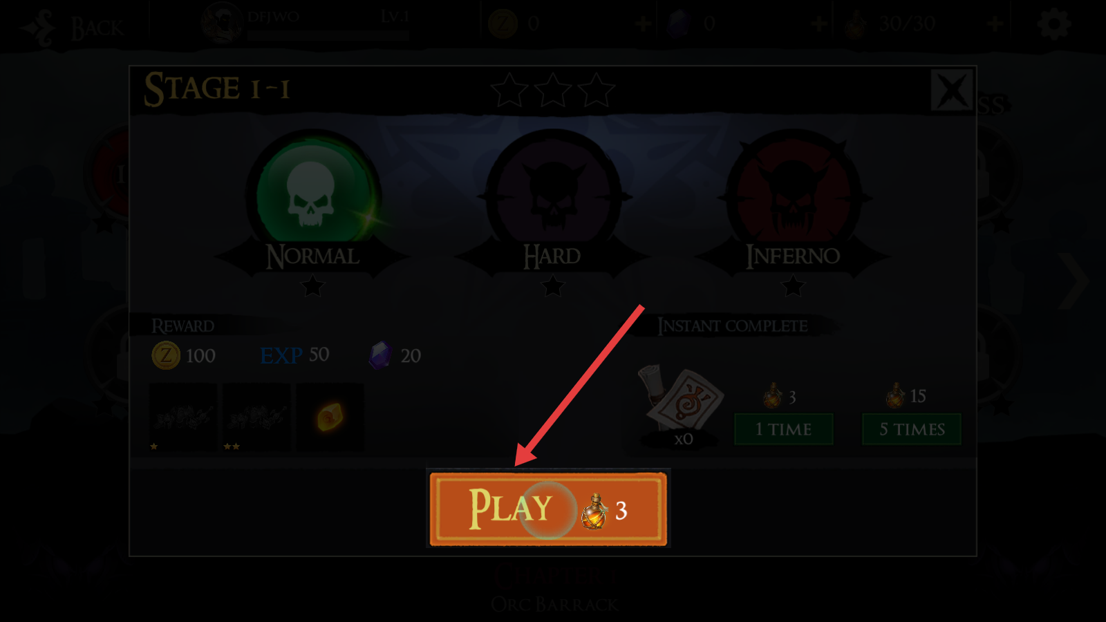 2、选NORMAL难度,确认奖励金币100、经验50等,点击橙色PLAY按钮,消耗3瓶道具进入关卡。
