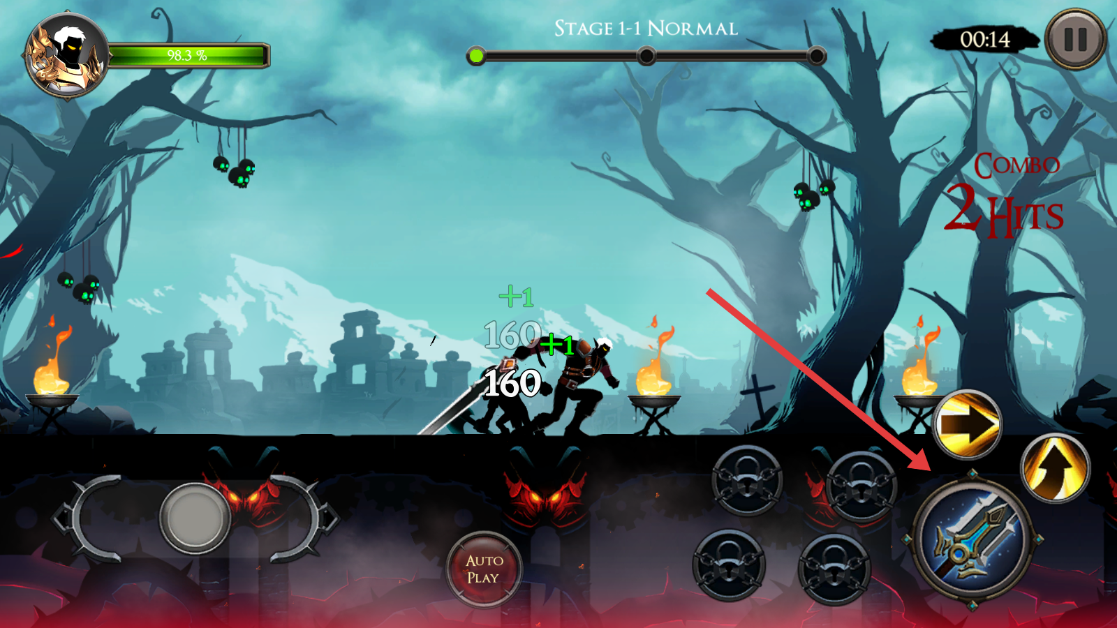 3、战斗中,用左侧虚拟摇杆移动角色,遇敌点击右侧武器技能图标攻击,配合闪避,积累连击通关。