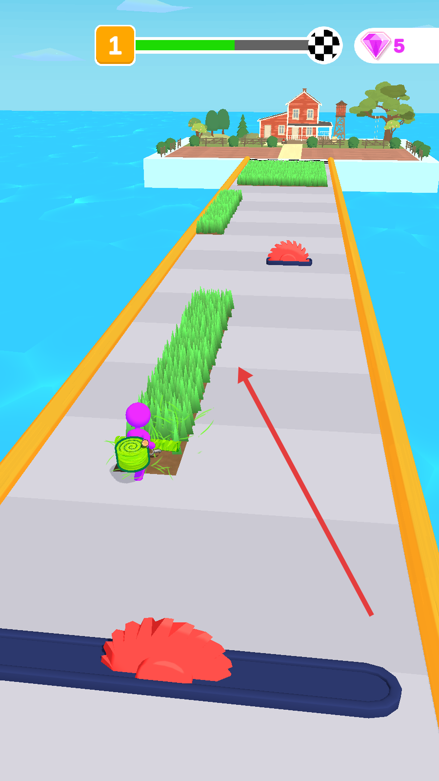 2、遇到草坪区域,优先切割收集,积累资源;遇齿轮快速滑动躲避,保持角色移动节奏。