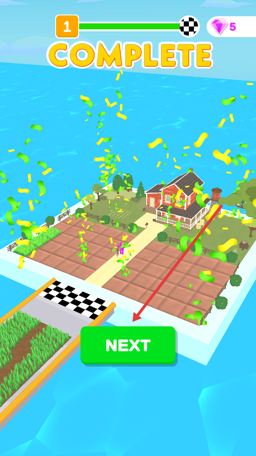 3、抵达终点COMPLETE界面,点击NEXT进入下一关,重复操作,挑战更多关卡,解锁岛屿新区域。