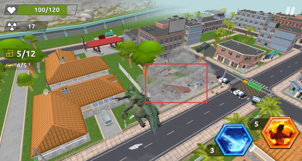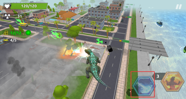 3、当哥斯拉生命值满额后,积极利用右侧技能,比如蓝色技能图标对应的技能,在破坏建筑、车辆时释放,高效完成任务。