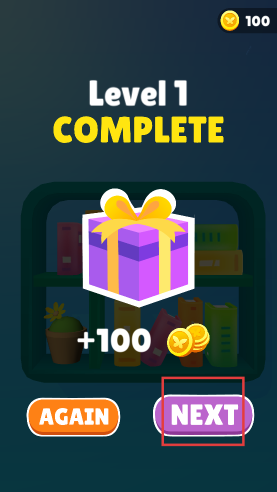 3、完成书籍整理后,点击“NEXT”按钮,进入下一关继续挑战,获得金币奖励可用于解锁新的皮肤。