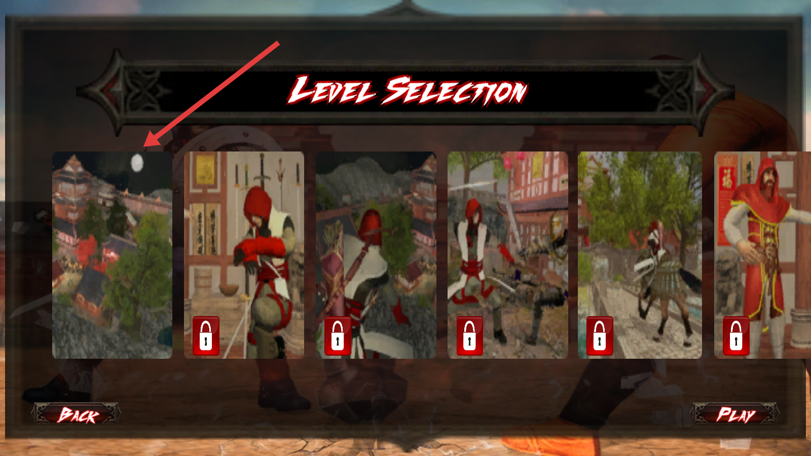 1、点击主界面左下角PLAY按钮,进入关卡选择页,选首关月夜建筑场景,点PLAY开始。
