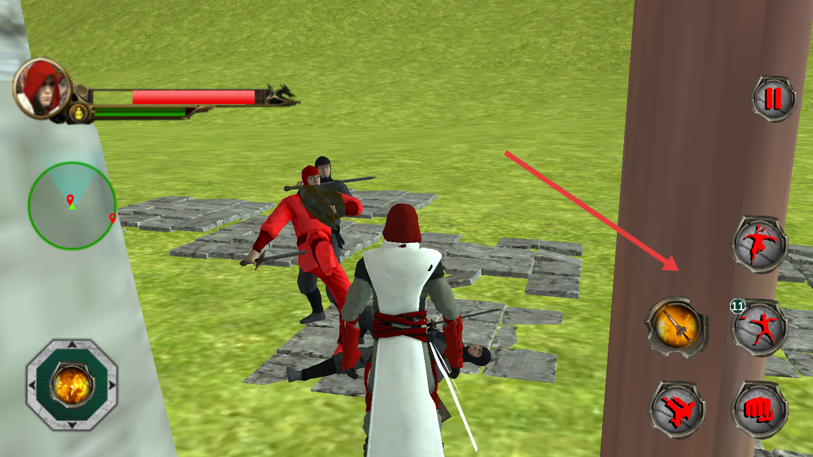 2、战斗时,用左侧摇杆移动角色白衣红帽,遇敌点击右侧技能图标武器、身法等攻击,优先集火残血。
