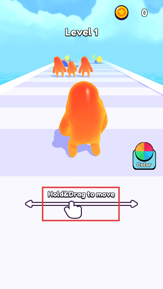 1、按住屏幕拖动,操控橙色果冻人在道路上移动,收集金币并靠近前方同类角色。