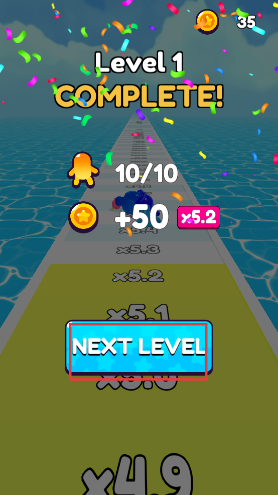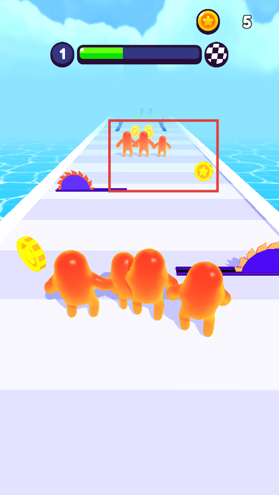 2、移动过程中,避开道路两侧的锯齿障碍,同时尽可能多收集金币,与前方果冻人汇合,壮大队伍。