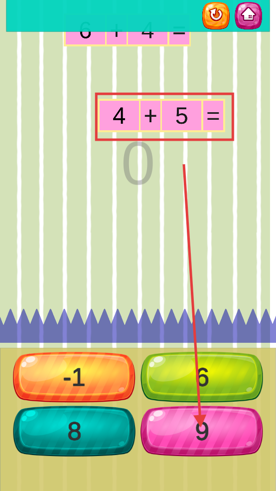 2、看到上方飘下一道题目,需要快速在脑海中计算,得出结果为9,然后精准点击下方粉色的“9”按钮。
