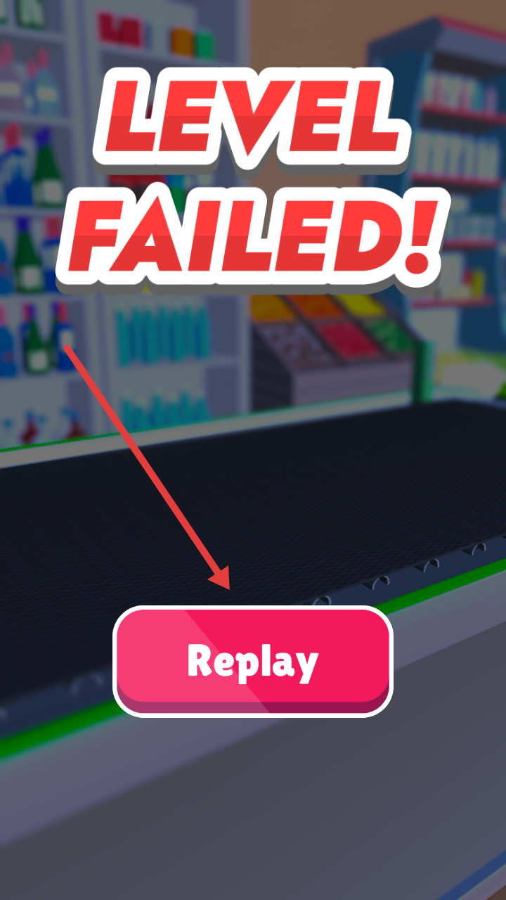 3、若屏幕显示LEVELFAILED,点击Replay重新开始游戏,总结之前失误原因,保障商品稳定在传送带上移动以成功通关。