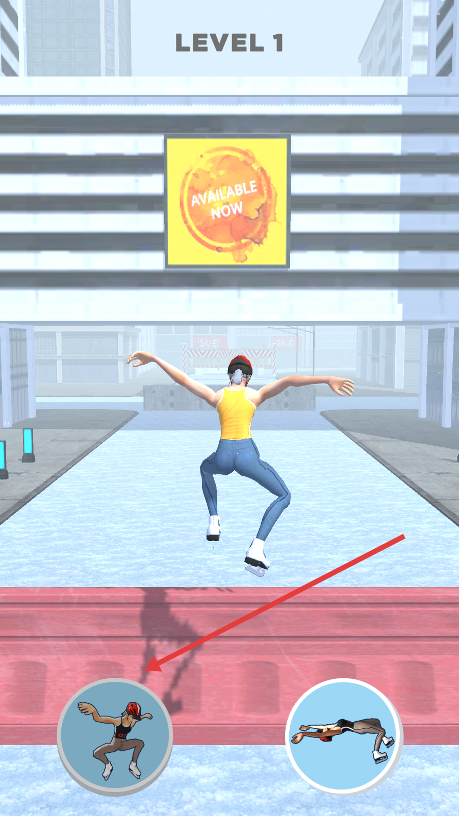1、点击TAPTOSTART,操控滑冰角色沿跑道滑行,遇台阶等障碍,选对应姿势图标如跳跃通过。