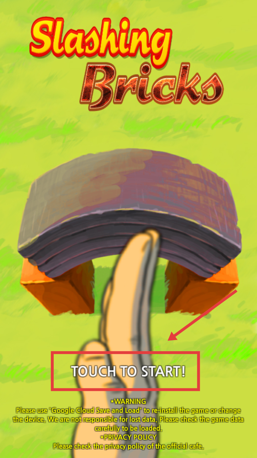 1、点击TOUCHTOSTART进入SlashingBricks,操控角色出拳,击打木桩积累破坏数。