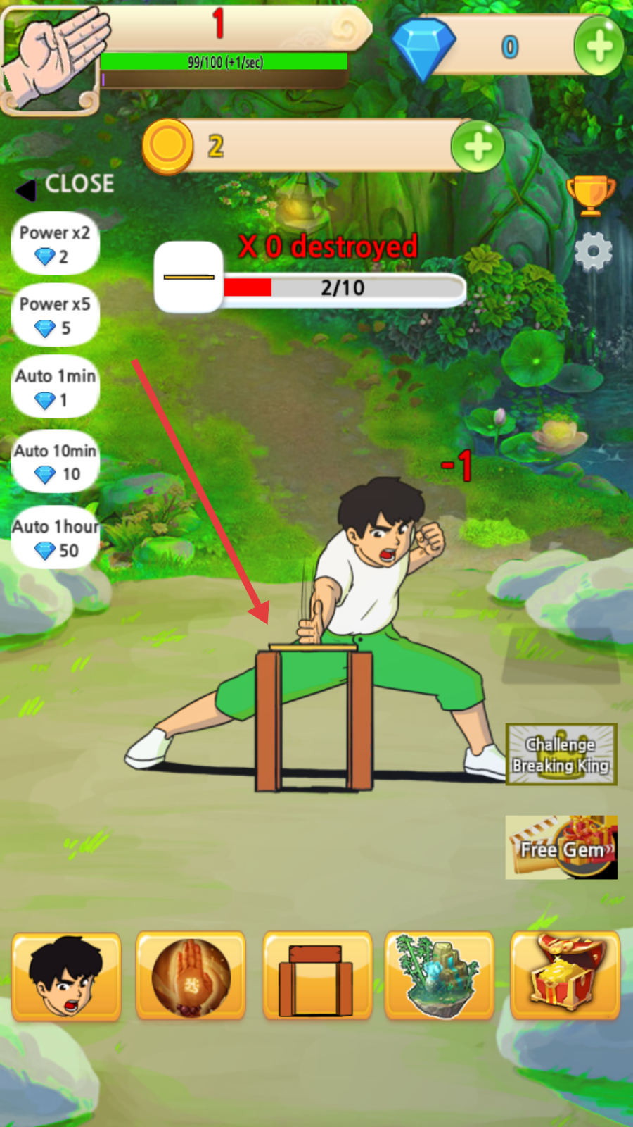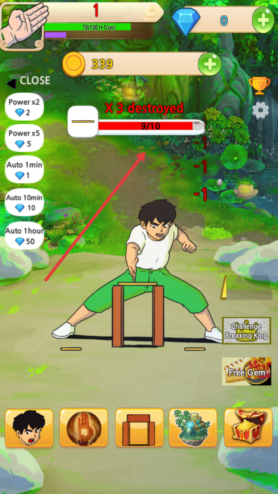 2、战斗时,紧盯破坏进度条,快速点击出拳,提升破坏效率,利用金币升级拳力Powerx2等。