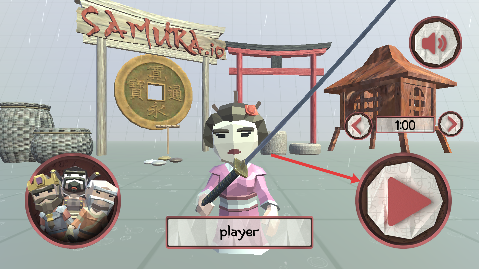 1、点击右侧红色三角播放键,选择持长刀和服角色,进入Samurai.io对战模式开始游戏。