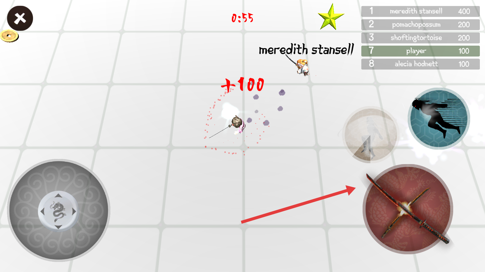 2、战斗时用左侧摇杆控制移动,点击右侧双刀技能键攻击,优先袭击残血玩家并躲避技能。