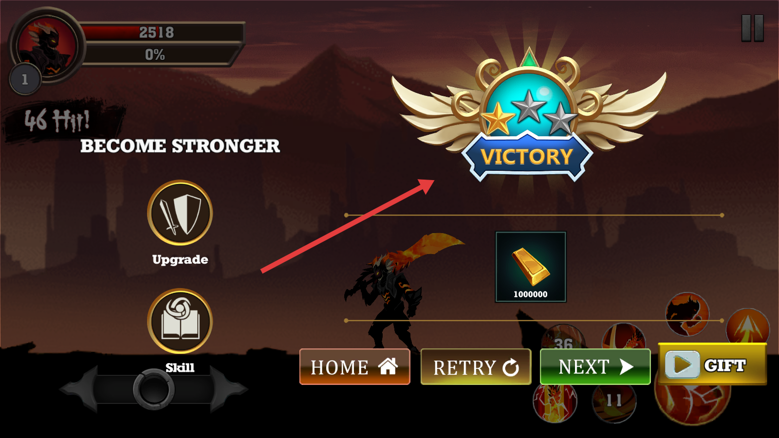 3、胜利后点NEXT进下一关,用奖励选Upgrade升级属性或Skill解锁新技能,增强战力。
