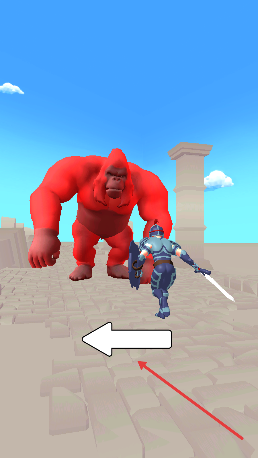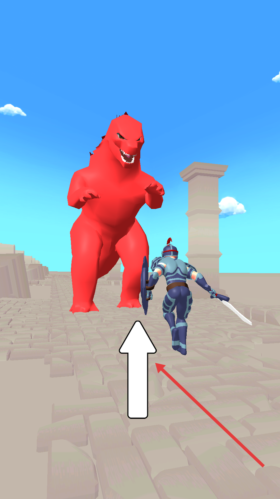 1、操控蓝甲持盾剑士,严格按照箭头指引方向移动,遭遇红猩猩、红恐龙等怪物,灵活走位躲避攻击。