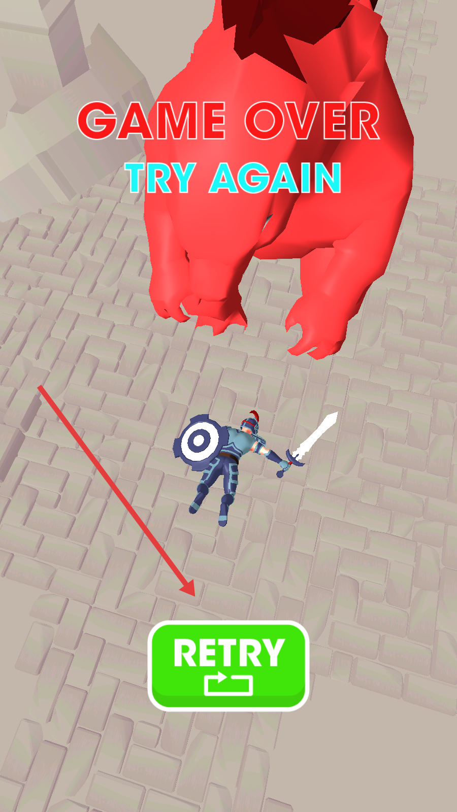 3、若显示GAMEOVER,点击RETRY重新开始,调整战斗策略,依靠走位、反击,击败巨兽通关。