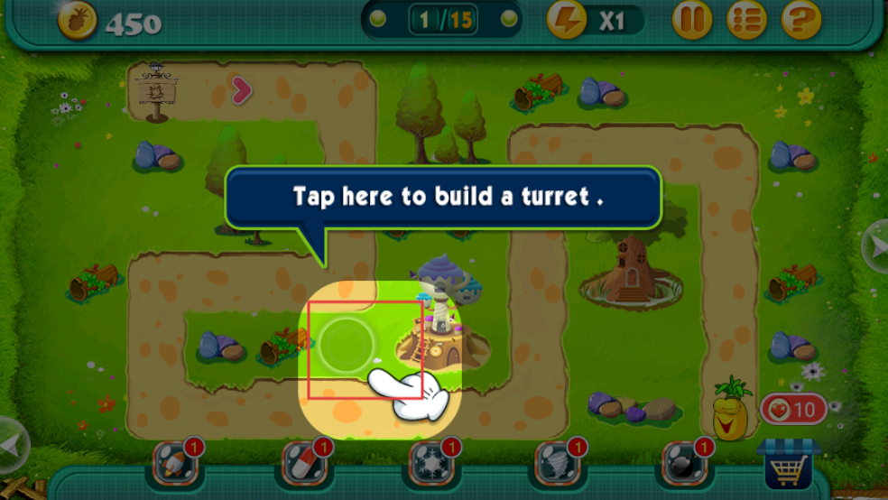 1、根据提示点击指定位置建造炮塔,要合理选择炮塔建造地点,尽量选在敌人行进路线的关键节点。