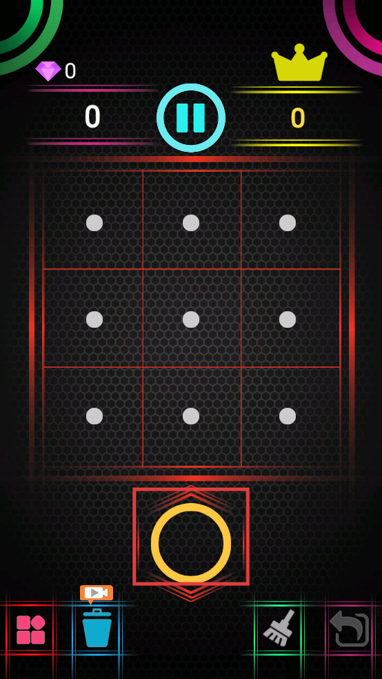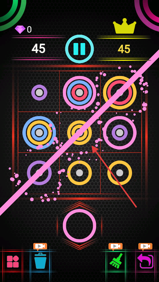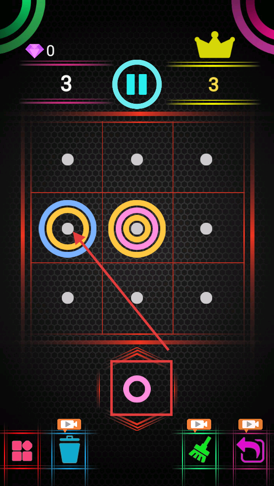 2、发射时要注意圆环颜色与网格中已有的圆环颜色匹配,尽量让同色圆环叠加,这样能更高效地获取分数。