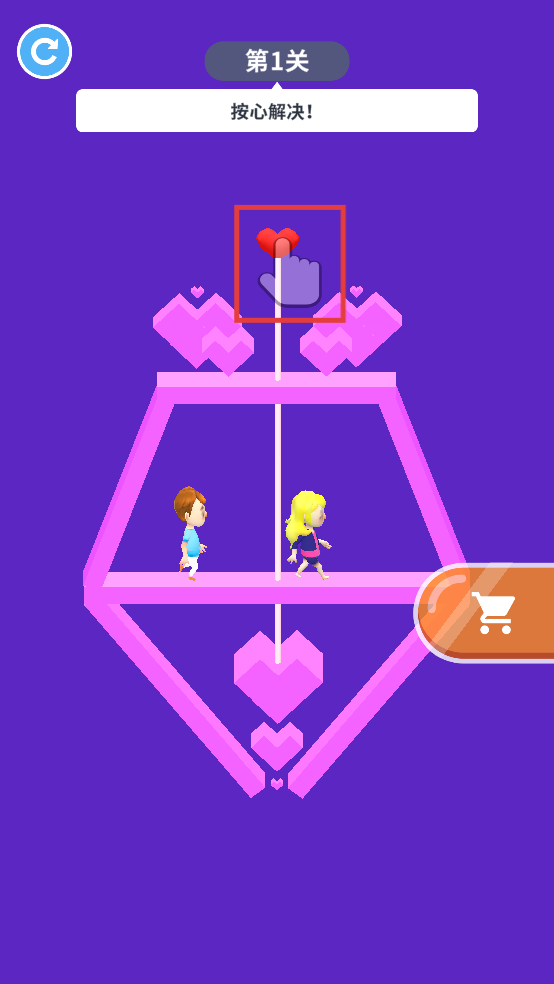 1、按照提示去点击上方的红色爱心,这样能让中间的线发生改变,进而可以让两侧的人物顺利地产生互动。