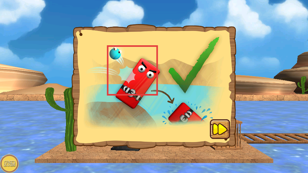1、观察提示画面,需利用蓝色小球撞击红色带愤怒表情的方块,使其落入水中,按此思路操作推进游戏。
