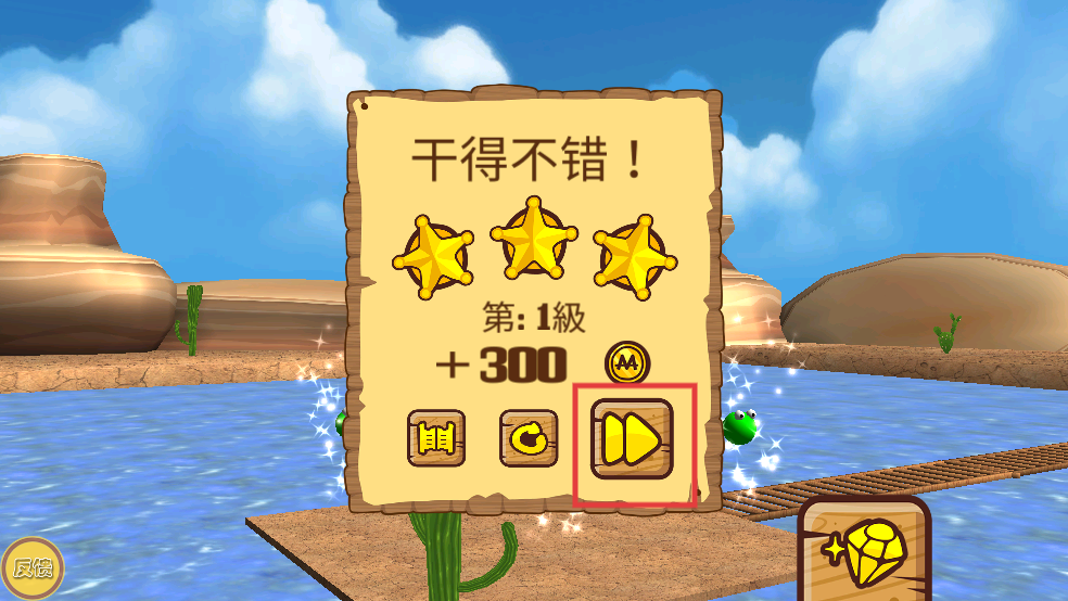 3、成功击溃坏猪并救出人质后,获得三颗星和300金币奖励,点击下方的箭头按钮进入下一级关卡。