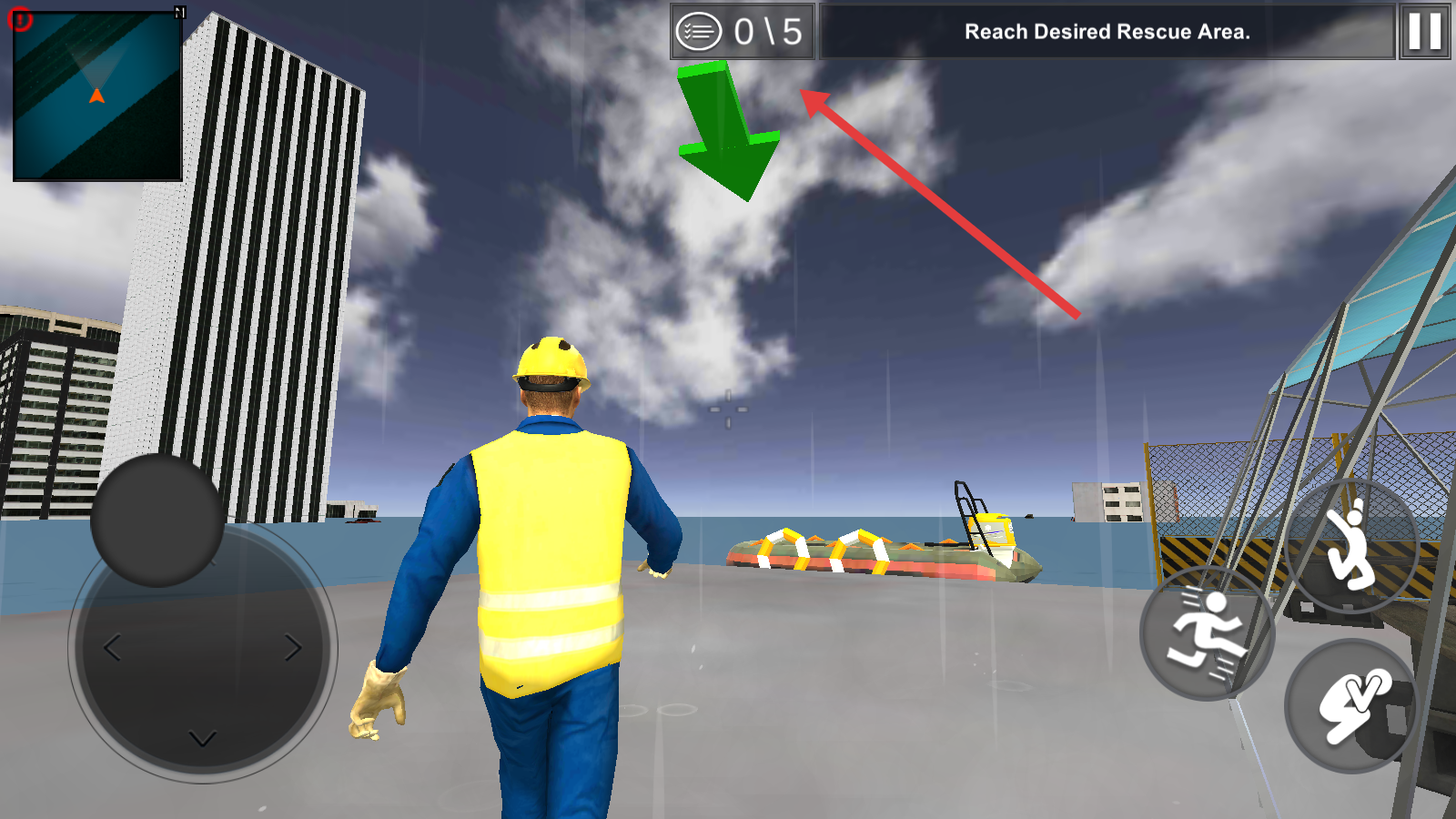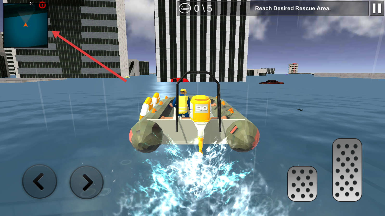 3、驾驶橡皮艇时,通过左右按键控方向,参照小地图指引,抵达指定水域,完成救援目标,推进关卡。