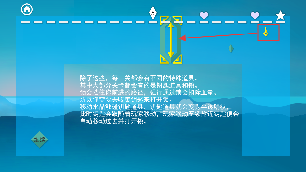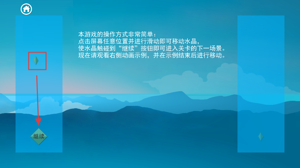 1、按照提示,点击屏幕任意位置并滑动,移动左侧的水晶,让其触碰下方“继续”按钮,从而进入关卡下一场景。