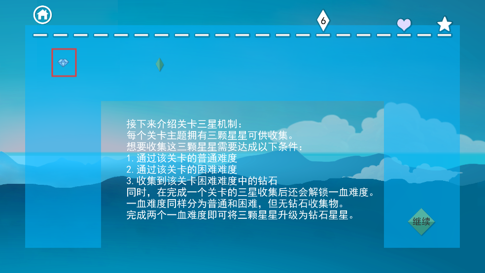 3、这里介绍了关卡的三星机制,我们想要拿到三星就得通关普通和困难难度,还需要收集图中的钻石才行。