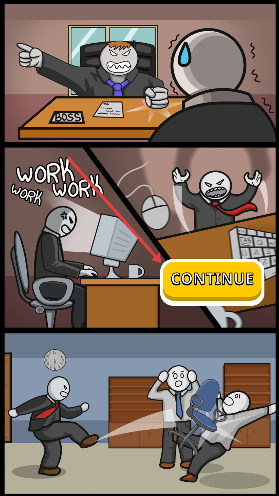 2、减压机制直观:战斗无复杂规则限制,可肆意破坏办公物品发泄情绪,击败敌人触发夸张倒地动画,暴力美学设计强化减压释放感。