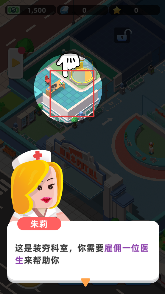 1、根据提示,点击“装穷科室”区域,准备雇佣医生来开展科室相关工作,推进游戏流程。