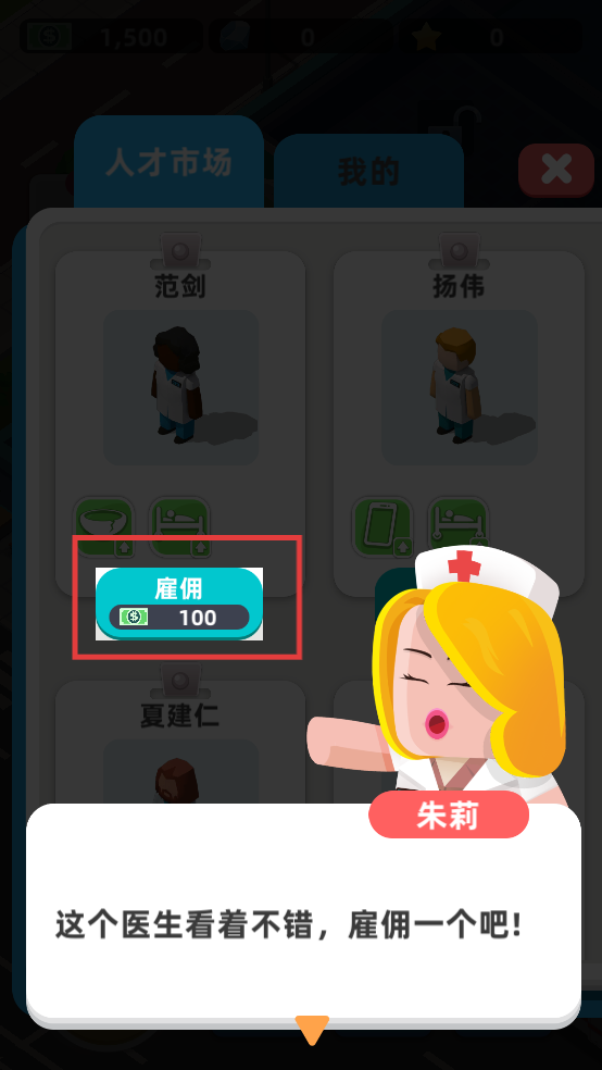 2、进入人才市场界面后,选择“范剑”医生,点击标有“雇佣100”的按钮,花费100货币雇佣该医生。