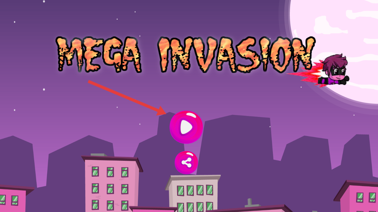 1、点击标题页粉色播放按钮,快速进入MEGAINVASION游戏,操控角色飞行,开启城市冒险之旅。