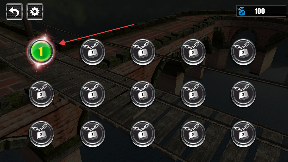 1、在关卡选择界面,点击标有“1”且发着绿色光的按钮,即可进入第一关的游戏场景。
