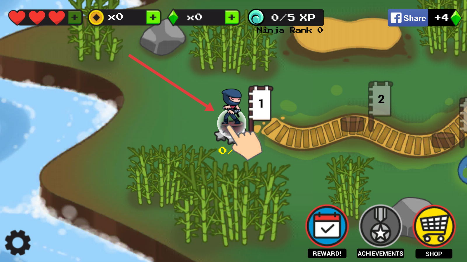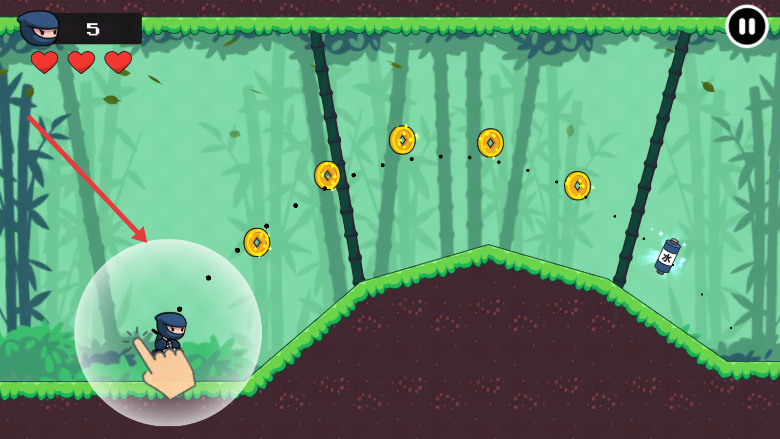 1、点击地图上标1的旗帜,进入竹林关卡,操控忍者角色,长按屏幕让忍者裹气泡滚动,收集金币。