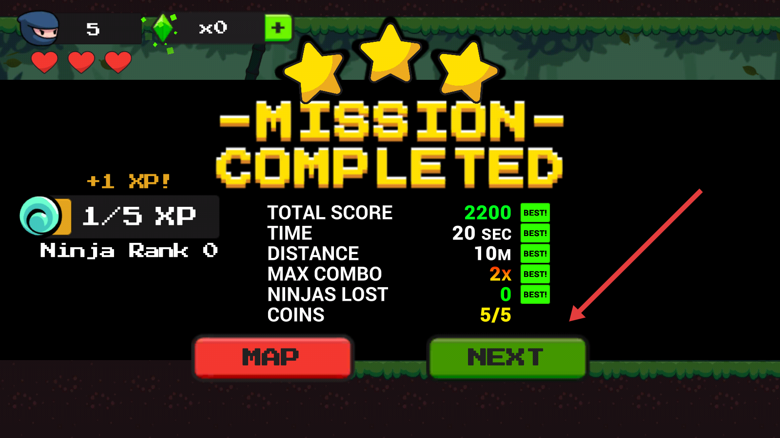 3、通关后,点NEXT进入新关卡,积累XP提升忍者等级,用金币、绿宝石解锁技能,强化战力。