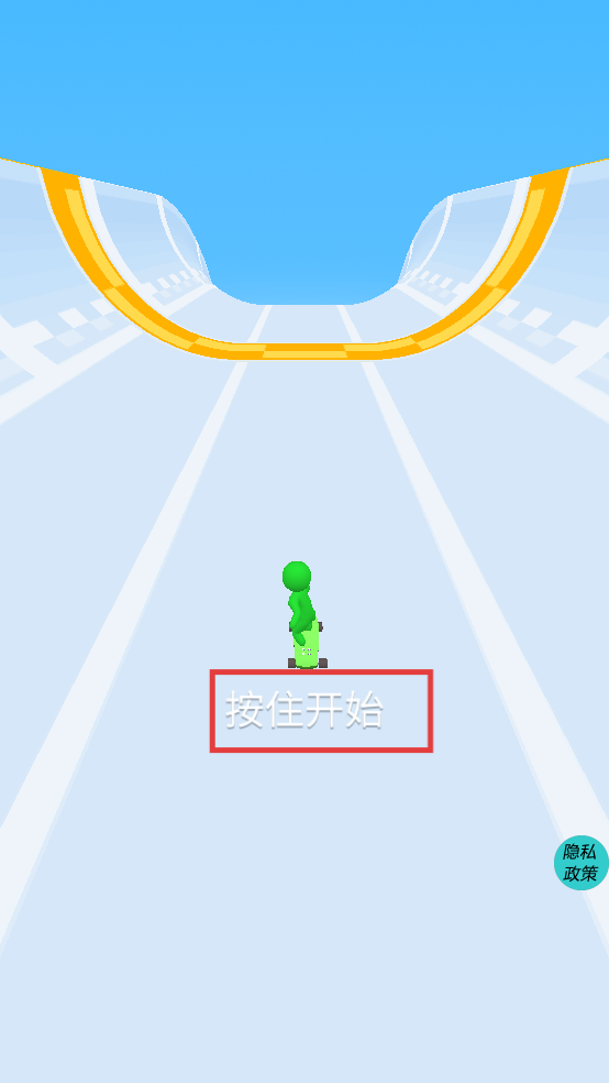 1、点击“按住开始”提示区域,启动绿色小人的滑板运动,开启游戏进程,准备在赛道上行驶。