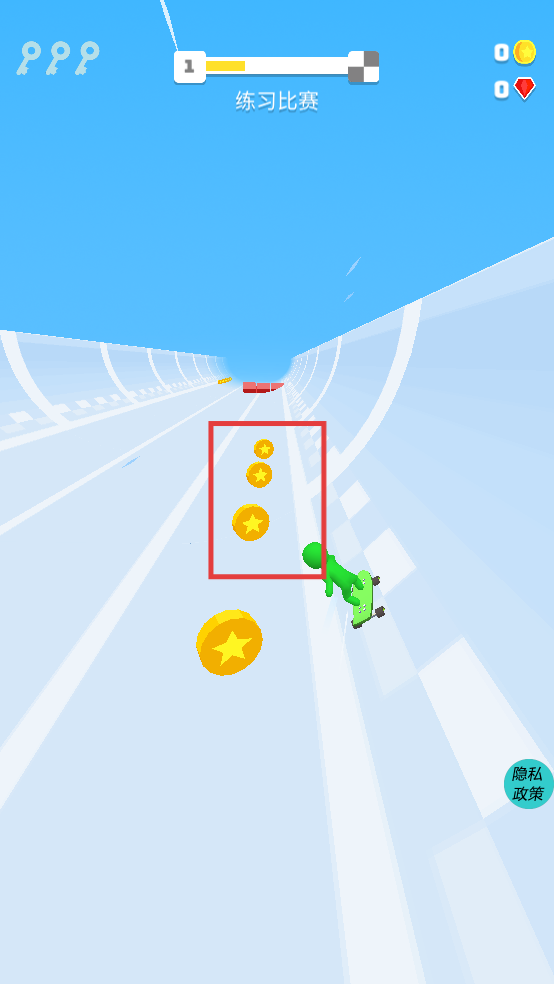 2、操控绿色小人在赛道上移动,尽可能多收集黄色带星的金币,同时注意躲避障碍,保持滑行的顺畅。