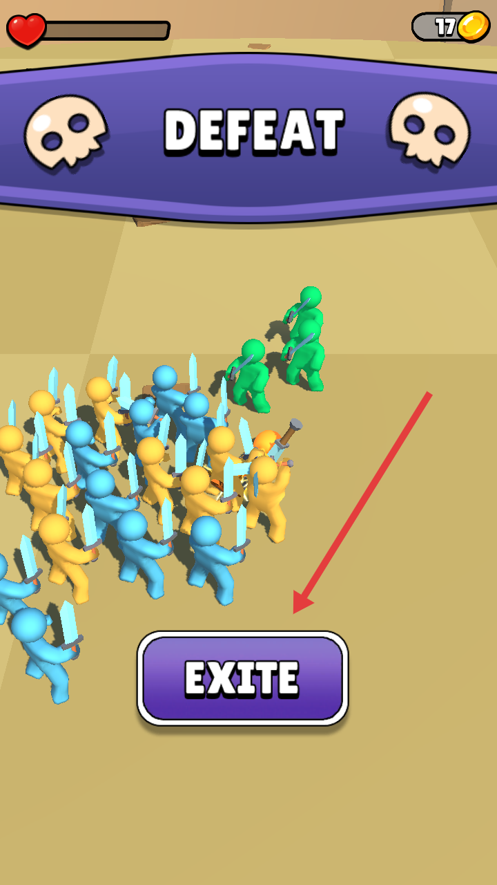 3、若战败,点击EXITE退出,积累金币强化角色、升级武器,调整策略重新挑战,争取胜利。