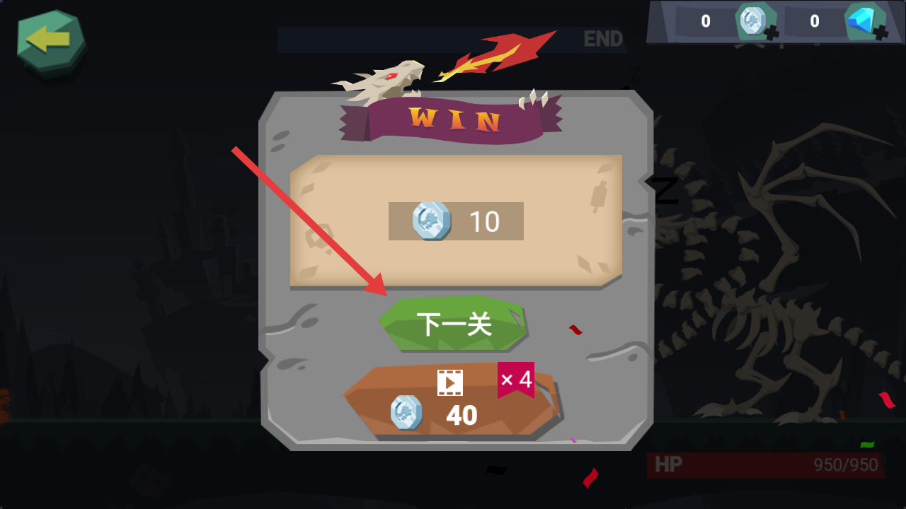 3、通关后,点击下一关继续挑战,用获得的10银币升级装备,或看广告领40银币,强化战力推进新关卡。