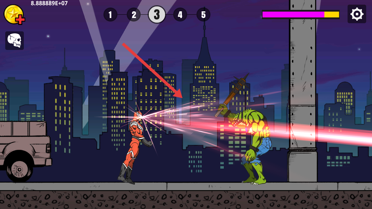 2、战斗中,利用英雄技能,如激光攻击,瞄准怪物弱点输出,注意躲避巨锤砸击,消耗其紫色血条。