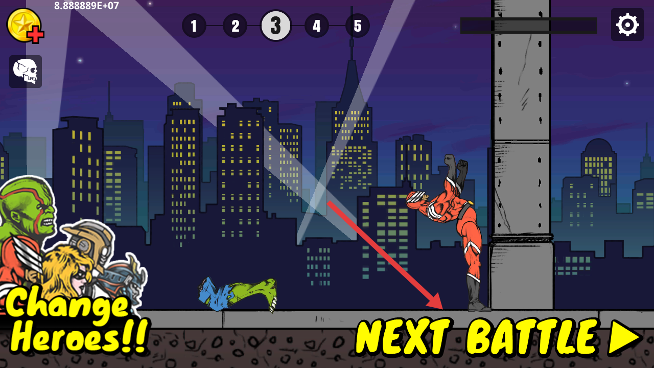 3、击败怪物后,点击NEXTBATTLE进入下一关,可通过ChangeHeroes切换英雄,用金币强化战力,持续挑战。