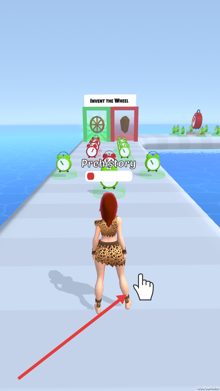 1、在Prehistory阶段,操控豹纹装角色,选择绿色闹钟路径对应轮子发明,避开红色闹钟,推进时代进度。