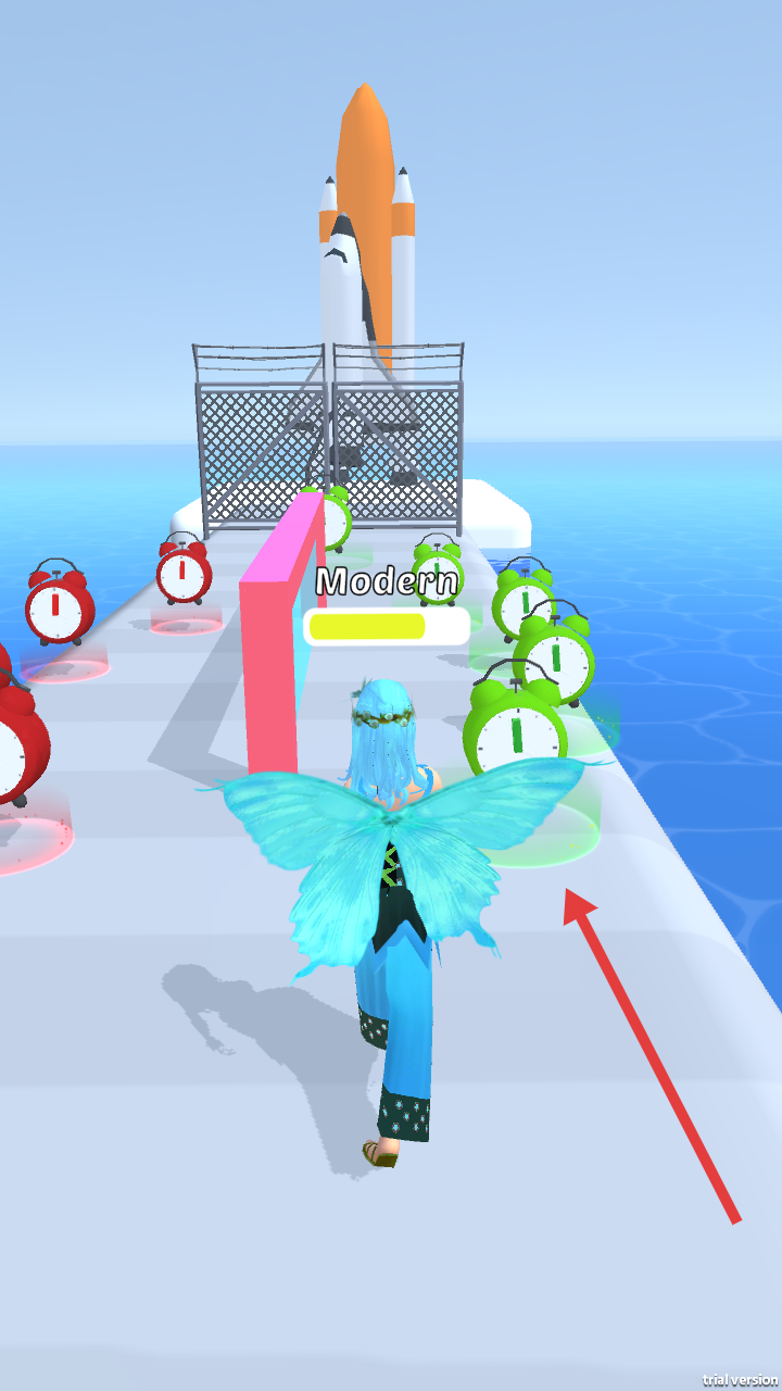 2、进入Modern阶段,切换为蝴蝶翅膀角色,持续收集绿色闹钟,靠近火箭图标,填充进度条,向Future迈进。