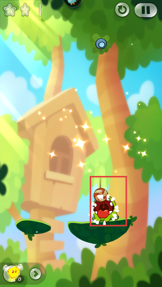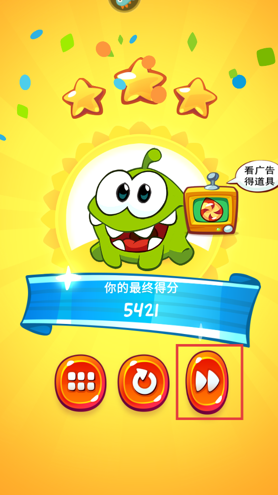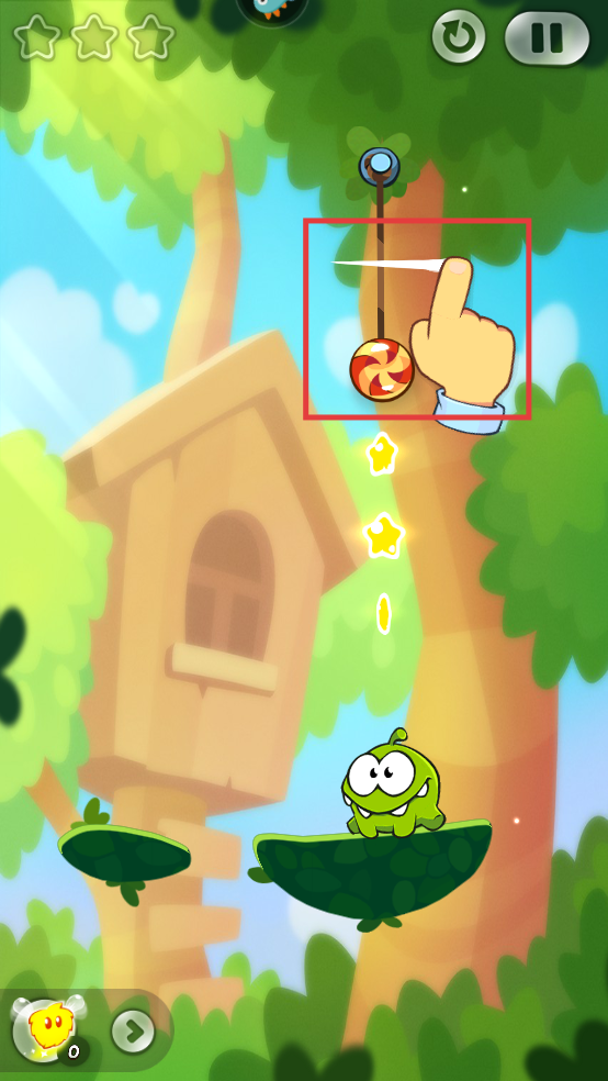 2、切割绳索后,糖果下落,调整切割时机与角度,确保糖果精准落入奥姆口中,提升得分。